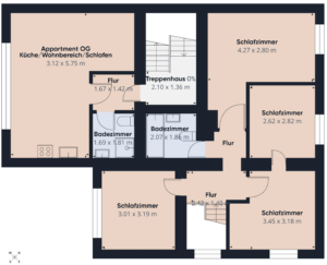 Die zweite Wohnung im Erdgeschoss mit ca. 90 m² verteilt sich auf Erd- und Obergeschoss und bietet direkten Zugang zur Terrasse und dem Garten – ideal für Familien. Im Erdgeschoss befindet sich ein großzügiges Wohn-Esszimmer mit wasserführendem Kamin, der in der kalten Jahreszeit wohlige Wärme spendet und mit der Abwärme das Heizungssystem unterstützt. Eine funktionale Einbauküche in U-Form (ohne E-Geräte) sowie ein Gäste-WC runden diese Ebene ab. Im Obergeschoss erwarten Sie drei Schlafzimmer, ein Durchgangsraum, der sich ideal als Arbeits- oder Hobbybereich eignet, sowie ein innenliegendes Bad mit Badewanne. Zusätzlich sorgt eine Klimaanlage im Obergeschoss für angenehme Temperaturen im Sommer.