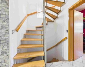 Über das offene Treppenhaus erreichen Sie sowohl das Obergeschoss als auch den Keller.