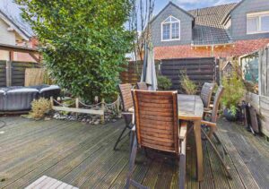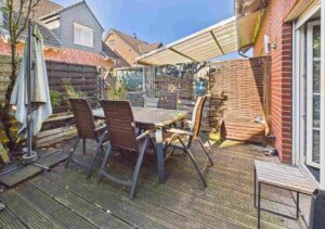 Von hier aus gelangen Sie direkt auf die Terrasse und in den pflegeleicht angelegten Garten. Der Terrassenbereich ist mit Holz belegt und bietet eine schöne Grundlage für Ihre persönliche Wohlfühloase – mit einem grünem Daumen lässt sich der Außenbereich wunderbar aufwerten.