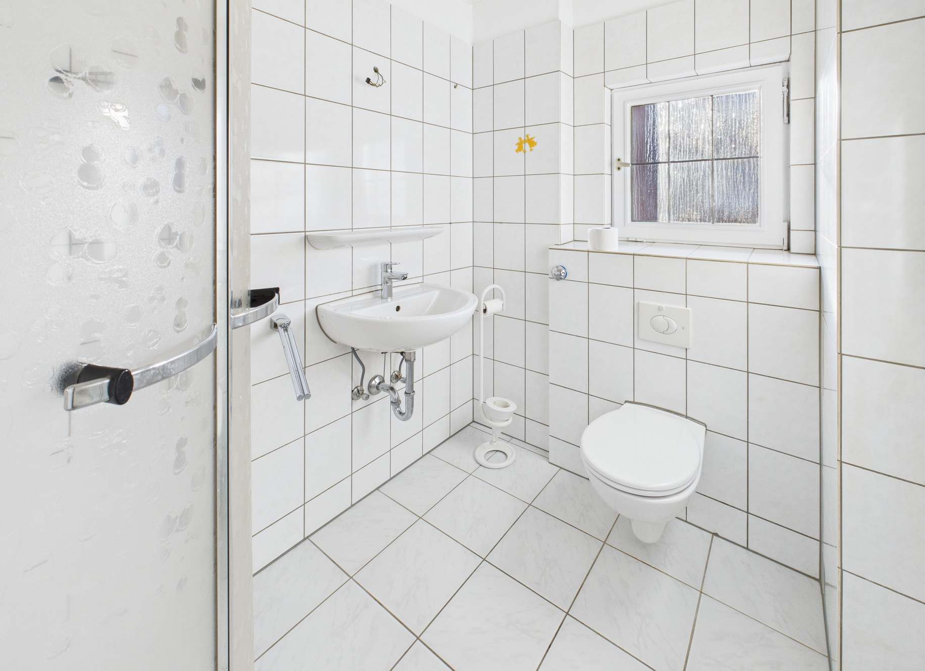 -Badezimmer mit Fenster, weiß gefliest, ausgestattet mit Dusche, WC und Waschbecken