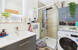 Das innenliegende, moderne Badezimmer wurde 2021 komplett saniert und mit einer komfortablen Dusche ausgestattet. Hier befindet sich auch der Stellplatz für Ihre Waschmaschine.