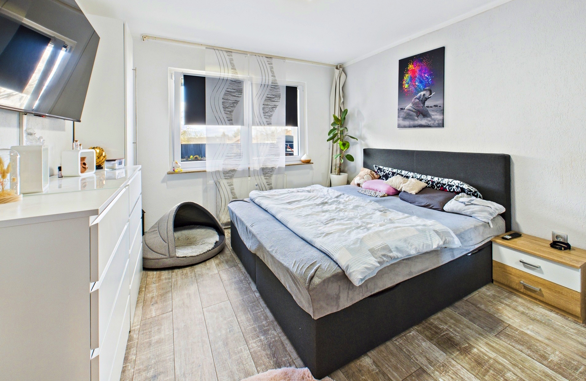 Das großzügige Elternschlafzimmer bietet Platz für ein großes Bett und einen geräumigen Kleiderschrank. Gegenüber liegt das Kinderzimmer, das sich auch hervorragend als Arbeits- oder Ankleidezimmer nutzen lässt.