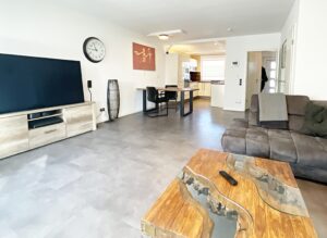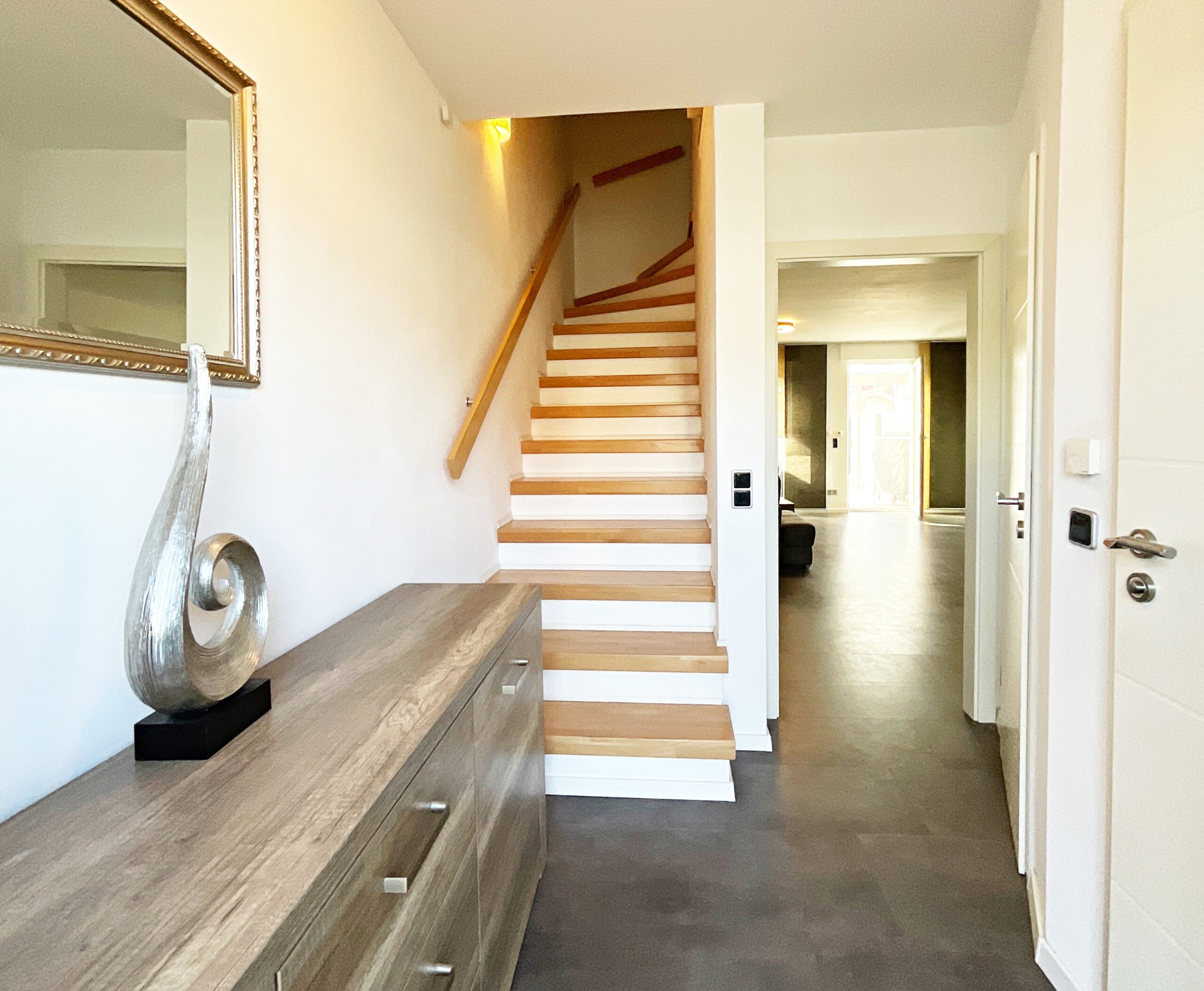 Beim Betreten des Hauses gelangen Sie in einen länglich geschnittenen Flur. Direkt an der Haustür befindet sich das Gäste-WC mit Fenster sowie ein kleiner Abstellraum, der auch die Versorgungsleitungen beherbergt. Vom Flur aus gelangen Sie in den Wohn- und Essbereich mit angrenzender offener Küche, die vom Vormieter gegen eine Abschlagszahlung übernommen werden kann. Die offene Gestaltung verleiht dem Erdgeschoss eine besondere Großzügigkeit. Zusätzlicher Stauraum unter der Treppe bietet Platz für Dinge, die nicht täglich benötigt werden.
