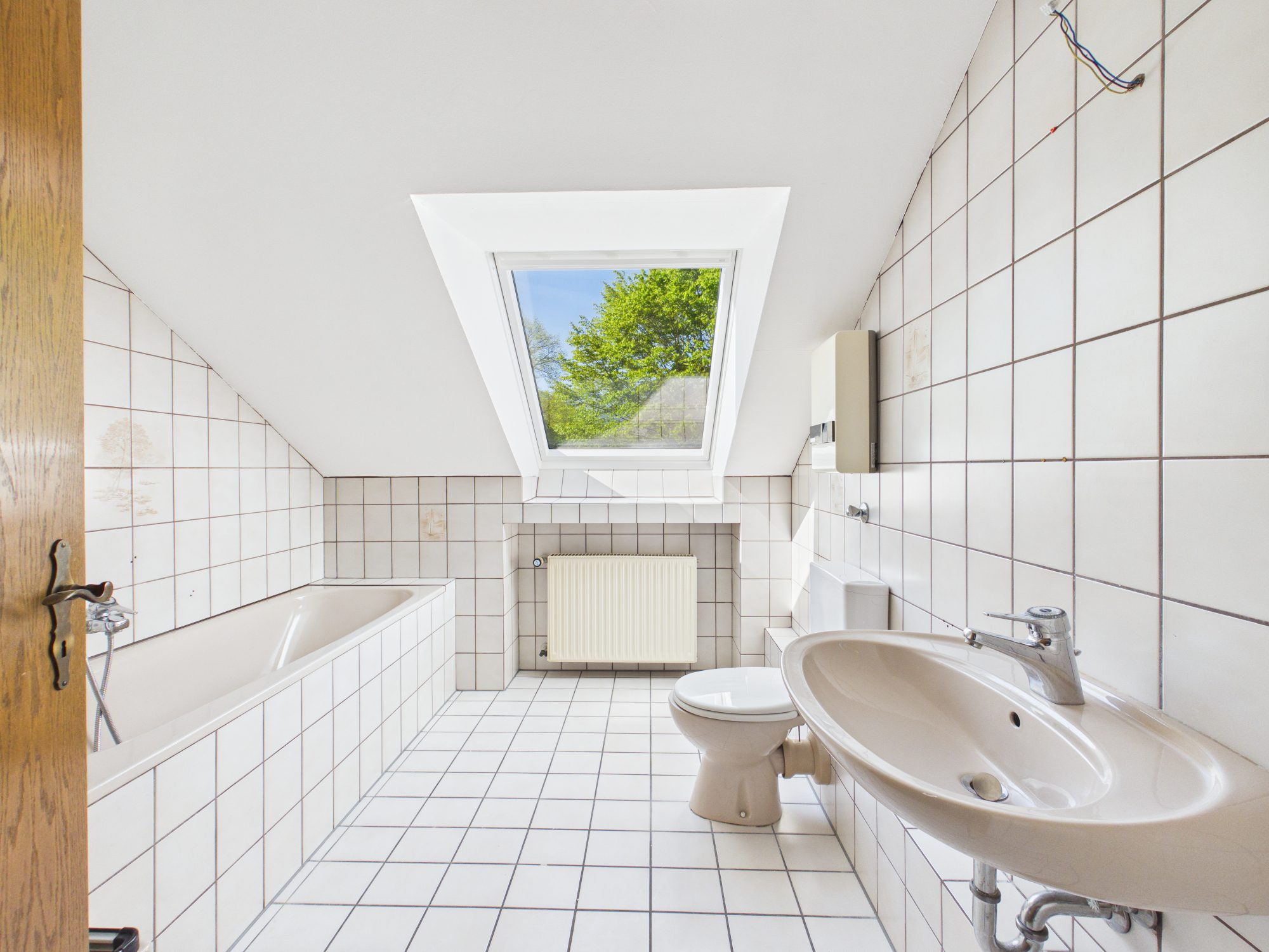 Das hell geflieste Tageslichtbad ist ausgestattet mit Badewanne, Dusche, WC und Waschbecken.