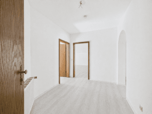 Bereits beim Betreten der Wohnung empfängt Sie ein großzügiger Eingangsbereich, der sich in zwei Dielen aufteilt und ausreichend Platz für Garderobe und Schuhschränke bietet. Ergänzend steht ein praktischer Abstellraum zur Verfügung.